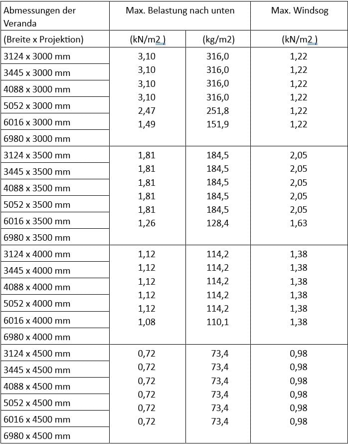 Bei der Breite 312,4 x Ausfall 300cm haben Sie die enorme Schneelast von 316 kg/m². Diese nimmt bei größeren Maßen etwas ab- bis zu 73,4kg/m² bei 601,6x 450cm. Die ausführliche Tabelle finden Sie hier: